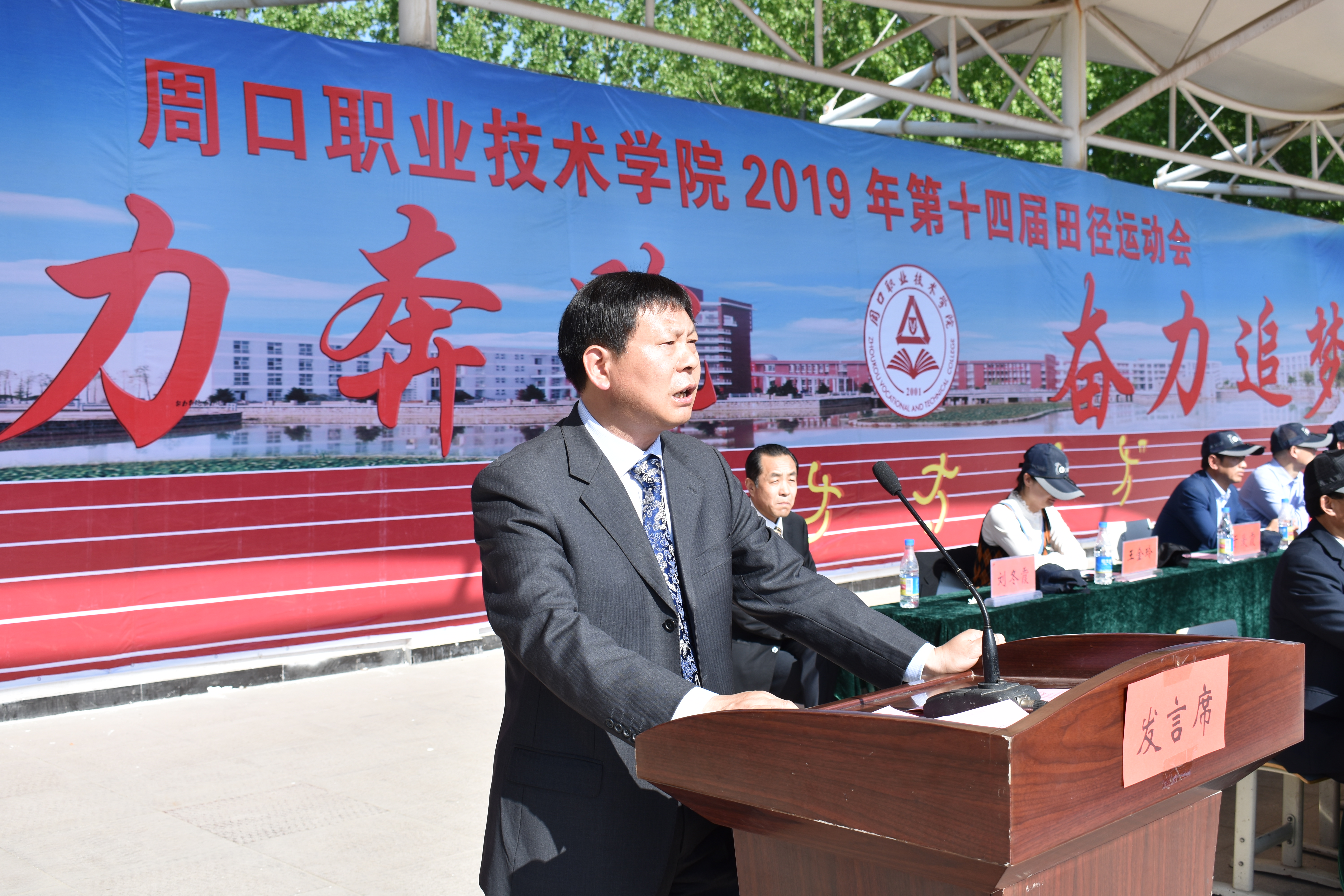 校长李清臣致开幕辞。他指出,长期以来,我校高度重视体育工作,始终坚持‘学校教育,健康第一’,积极开展‘阳光体育运动’,组织丰富多彩的体育赛事,增强广大师生的身体素质。他表示,周口职业技术学院多措并举加强文体基础设施建设,开元、文昌校区标准化体育场、开元校区体育馆先后建成投入使用。通过广大师生的不懈努力,校园体育设施日臻完善,体育氛围日益浓厚,师生多次在省、市运动会等各类比赛中取得骄人成绩。一年一度的田径运动会,不仅是对全校体育教学工作、师生精神面貌的一次大检阅,也是广大师生个性特长及运动风采的一次大比武,更是各参赛队伍竞争意识、团队协作、顽强拼搏精神的综合体现,必将进一步推动全校体育工作乃至各项事业的快速发展。