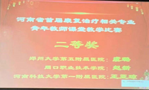 本次比赛,全省共有河南中医药大学、郑大五附院、河南科技大学一附院、河南大学一附院等17个本、专科学校和医院派选手参加。共设一等奖2名,二等奖3名,三等奖5名。医学院康复专业赵新教师,经过精心的准备,沉稳发挥,无论是教案书写、教学设计还是教学过程等环节都赢得了专家评委的一致好评,最终获得了比赛的第4名(二等奖)。同时,指导老师吕月桂荣获“伯乐奖”,我校还荣获了“优秀组织奖”。