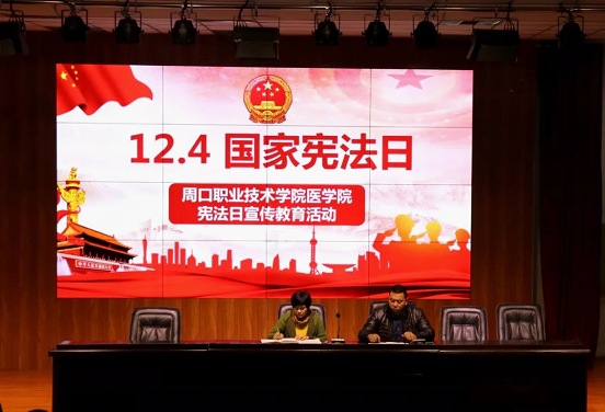 为深入贯彻落实党的十九大精神和全国教育大会精神,增强全民弘扬宪法精神和维护宪法权威的思想自觉和行动自觉,推动树立宪法至上的理念。根据教育部、河南省教育厅对做好2018年“12•4”国家宪法日系列宣传活动的部署要求,响应学院集中开展宪法系列主题教育活动的通知。12月3日下午在第五个国家宪法日到来之际,医学院在文昌校区多媒体报告厅召开了“周口职业技术学院医学院宪法日宣传教育活动”。医学院副院长王金玲、学生科长张建刚、全体辅导员、全体学生干部、各班班长参加了会议。