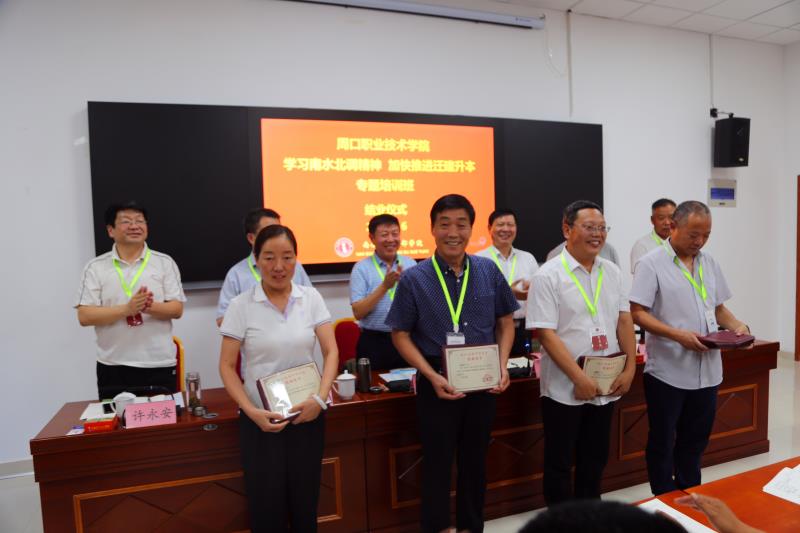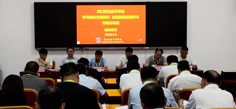 2020年8月4日-7日,我校“弘扬南水北调精神、加快推进迁建升本”培训班按照课程安排,如期完成培训内容,在南北水调干部学院圆满结业。此次学习共培训学员51人,校党委书记刘士欣、校长李清臣,校领导赵振然、李庶泉、许永安、唐永宾及全体参训学员参加结业仪式,仪式由校长李清臣主持。
