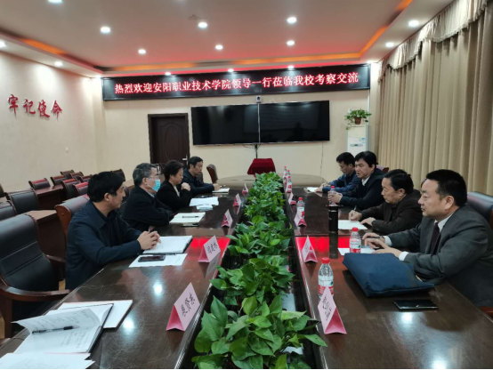 赵振然代表学校对安阳职业技术学院一行来访表示热烈欢迎,并介绍了我校的基本情况。李铜介绍了本次来校考察交流的目的,对我校的热情接待表示感谢,并希望两校加强联系,互相学习、互相借鉴,共同促进发展。