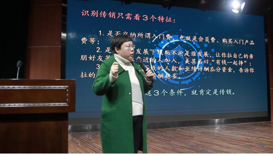 学校各院系700余名师生参加了防止传销进校园普法大讲堂讲座。河南广播电视台《河南市场监管——规直打传在行动》执行制片人张丽红在打传规直普法大讲堂上做了专题讲座,详细剖析网络传销诈骗实质和常用的骗人伎俩,为大学生们上了一堂生动鲜活的传销识别和防范课。