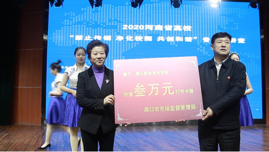各位领导对同学们寄予厚望,为了让同学们能够敲响警钟,提高警惕,多多学习了解传销的特点和危害,提高识别、防范、拒绝传销的意识和能力,活动现场,周口市打传办主任、周口市市场监督管理局党组成员王树平向周口职业技术学院赠送价值三万元的打传书籍《大学生网络消费知识手册》。周口职业技术学院副校长李秀萍接受赠书并表示感谢。