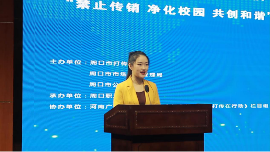 活动现场,周口职业技术学院副校长李秀萍首先致欢迎词,对各位领导的莅临,表示热烈的欢迎和衷心的感谢!同时表示针对传销向大学校园蔓延的趋势,必须加强学生的反传销教育。我校一定会加强组织领导,主动融入全省打击传销、抵御传销的工作大局中,创新工作方法,形成自己的特色和效应。在全校形成全员参与、齐抓共管的反传销工作局面,共同筑起抵御和防范传销的铜墙铁壁,让我们的社会更加和谐、公正、美好。