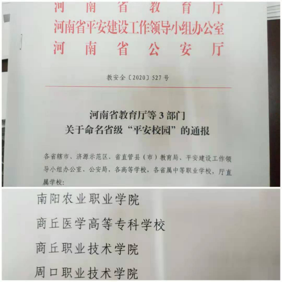 2020年12月25日河南省教育厅、河南省平安建设工作领导小组办公室、河南省公安厅三部门联合下发了《关于命名省级“平安校园”的通报》(教安全【2020】527号),我校首次被命名为省级“平安校园”。
