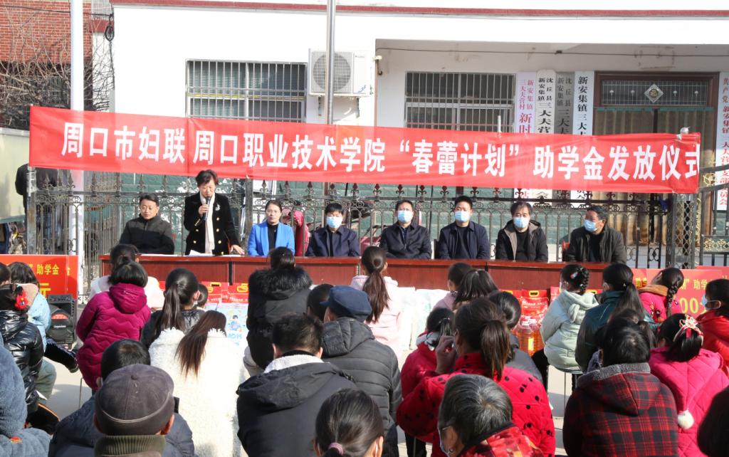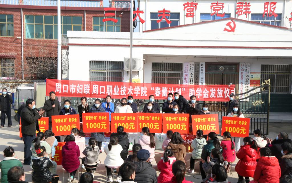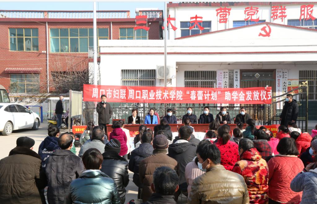 1月30日,我校在定点扶贫村沈丘县新安集镇三大夫营村举行“春蕾计划”助学金发放仪式暨春节前走访慰问活动。校党委书记刘士欣、校长李清臣、周口市妇联副主席孙媛媛、校党委副书记赵振然、副校长李秀萍出席活动。活动由我校驻三大夫营村第一书记王彦伟主持。