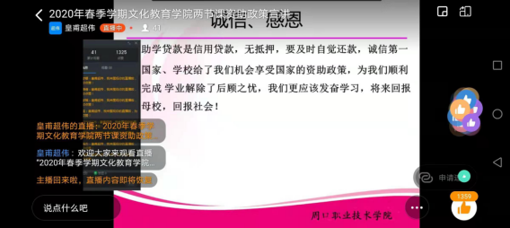 由于受疫情影响,我校2020年春季资助政策宣讲会以线上方式开展,班级辅导员通过微信群、QQ群、钉钉等开展线上资助政策宣讲。通过此次活动,宣讲了国家、省和学校的各项资助,并进行了按时还款和诚信教育。
