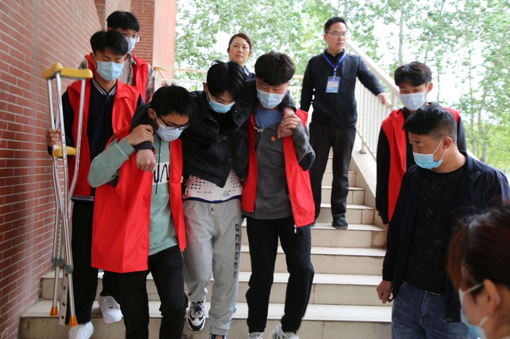 4月18日上午,我校2021年高职单独招生考试进入第二天。来自商水县的考生李家俊在考试前不慎扭伤导致左脚脚踝骨折,在家人的陪同下李家俊同学坚持参加考试。由于家长不能进入考场,得知情况后,文化教育学院党总支书记唐文杰、院长王隼和志愿者同学一起在上午文化课考试结束后,搀扶着将李家俊同学安全送到等候在楼下的家人那里。下午的技能测试学校专门为其开辟了绿色通道,安排李家俊第一个参加测试。李家俊在顺利完成考试后激动地说:“谢谢周口职业技术学院的老师、同学们,感觉心里特别温暖,期待着九月能在校园里和你们再见!”