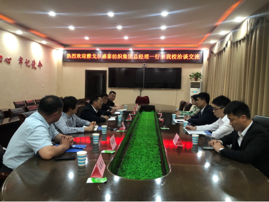 5月11日下午,雅戈尔盛泰纺织集团有限公司总经理崔玮聪一行三人来我校洽谈校企合作事宜。副校长李明臣及相关部门负责人参加会谈。