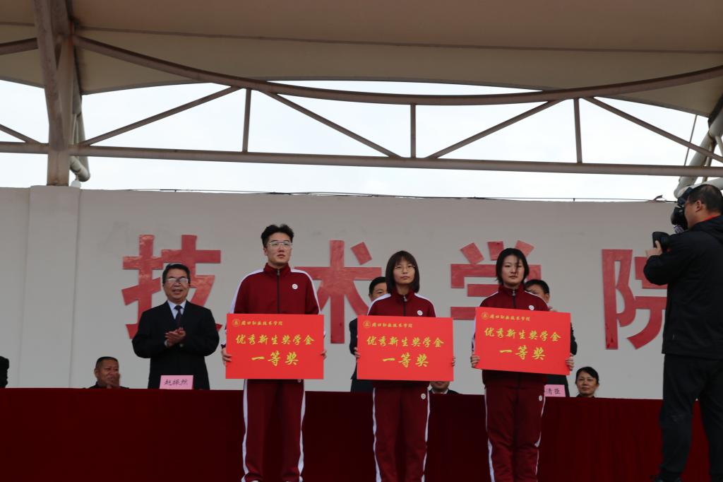 党委副书记赵振然宣读《周口职业技术学院关于表彰2021级优秀新生奖学金获奖学生的决定》。刘士欣、李清臣等校领导对获得2021级优秀新生奖学金获奖学生进行颁奖。