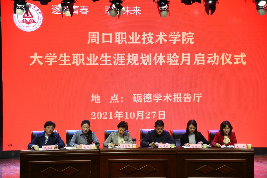 2021年10月27日下午,在砺德学术报告厅,随着副校长李秀萍宣布:“规划自我,梦想启航”周口职业技术学院2021大学生职业规划体验月活动正式启动,我校2021年度大学生职业生涯规划体验月活动正式拉开帷幕。校教务处、学生处、团委等职能部门负责人,各二级院(部)党总支书记、主管学生副院长、学管办主任、就业指导员、辅导员、职业生涯和就业指导课程教师、参加职业生涯规划大赛的学生、辅导教师及招生就业处人员参加了启动仪式。启动仪式由招生就业处处长武金娟主持。