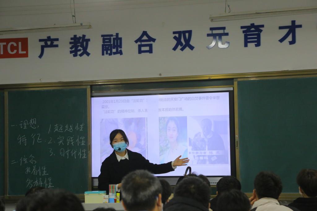 11月17日上午,校长李清臣、党委副书记赵振然、纪委书记唐永宾、教务处处长付晓东在思政部、汽车与机电工程学院等相关部门负责人的陪同下,走进6204教师随堂听评思政课教师袁会敏为2021级机电2班讲授《思想道德与法治》课程之“追求远大理想,坚定崇高信念”。