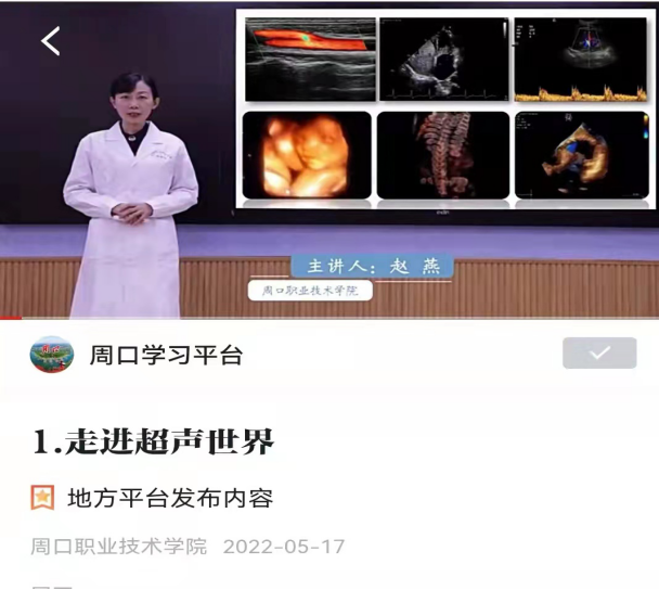 近日,周口职业技术学院医学院赵燕老师团队推出的《超声诊断学》课程成功入选“学习强国”慕课。此前,该课程已经入选省级精品线上开放课程项目,并在智慧职教MOOC学院(慕课)网络播发。
