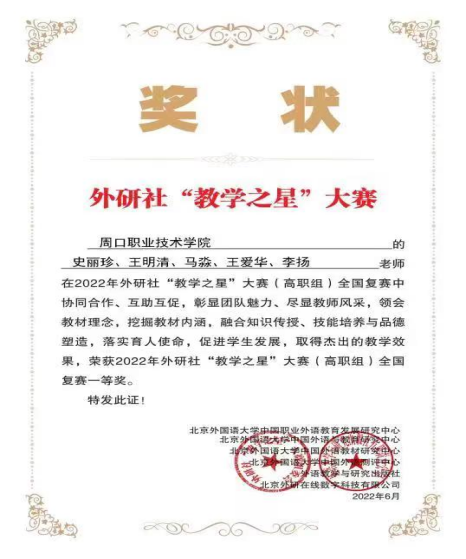 近日,2022年外研社“教学之星”大赛(高职组)全国复赛结果揭晓,我校文化教育学院教师史丽珍、王明清、马淼、王爱华、李扬组成的参赛团队获得本届大赛(高职组)全国复赛一等奖。
