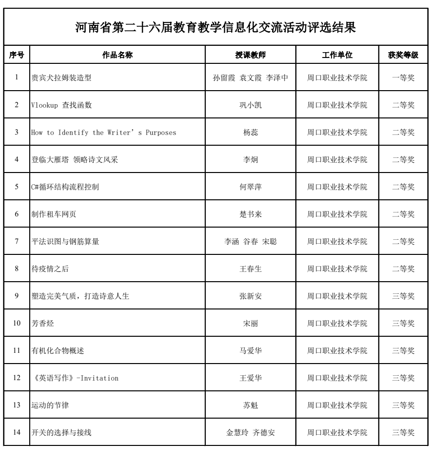 近日,河南省教育厅公布了河南省第二十六届教育教学信息化交流活动评选结果,我校共有14件作品获奖,其中一等奖1项、二等奖7项、三等奖6项。