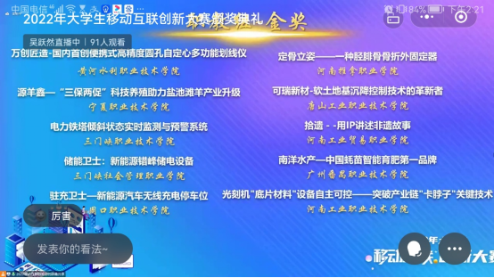 11月10日下午,第八届大学生移动互联创新大赛总决赛举行颁奖仪式。我校汽车与机电工程学院驻充卫士--新能源汽车无线充电停车位项目(第一指导教师:刘胜杰)荣获职教组金奖,文化教育学院的博巴仓--藏域风情沉浸式体验馆项目(第一指导教师:张文华)荣获得职教组银奖,汽车与机电工程学院的扑翼--梦工厂项目(第一指导教师:段丽清)、供暖先锋--PTC陶瓷热循环电暖装置(第一指导教师:刘胜杰)和信息工程学院的科技赋能--养生新风尚项目(第一指导教师:张辉)等3个项目分别荣获得职教组铜奖,学校荣获优秀组织奖。