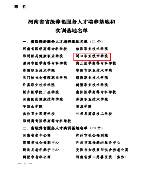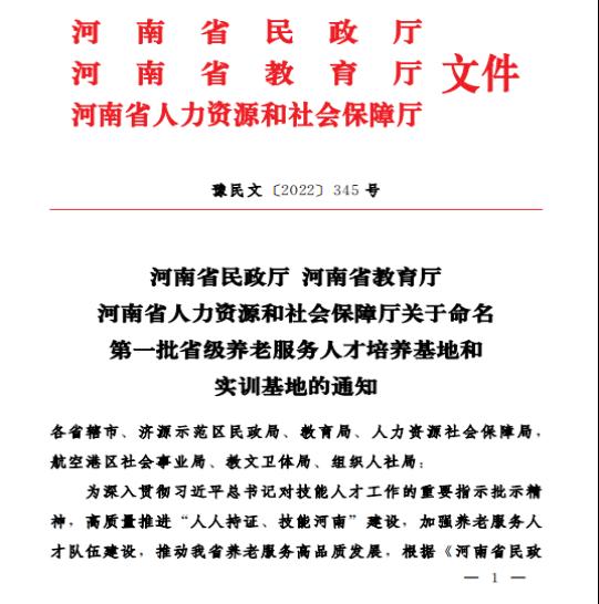 日前,河南省民政厅、河南省教育厅、河南省人力资源和社会保障厅联合发文,命名第一批省级养老服务人才培养基地和实训基地,我校获批首批省级21家养老服务人才培养基地之一。