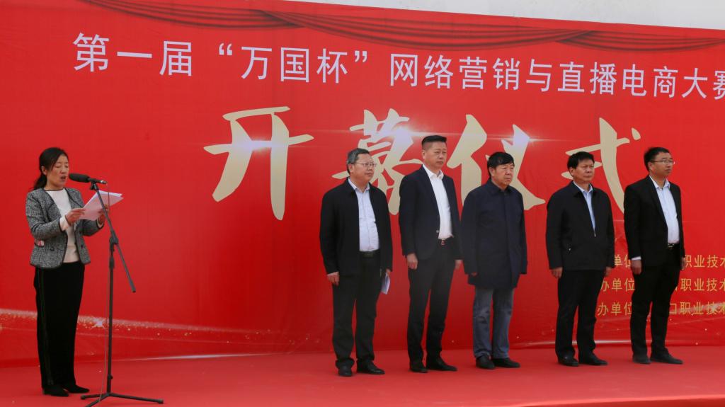 3月15日上午,周口职业技术学院第一届“万国杯”网络营销与直播电商大赛开幕式在开元校区隆重举行。学校党委书记刘士欣、校长李清臣,副校长李明臣,河南万国集团董事长吕辉及相关负责人出席开幕式。周口职业技术学院万国汽车商学院师生、参赛选手和裁判员等参加活动。
