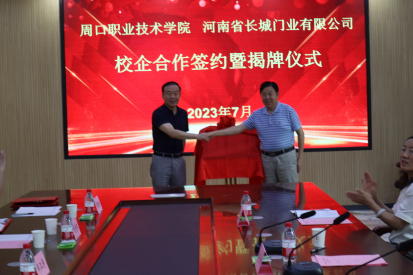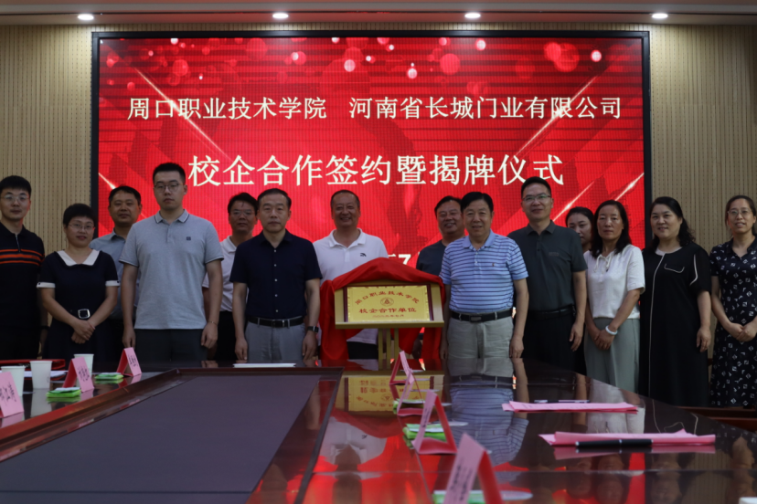 7月3号上午,周口职业技术学院与河南长城门业有限公司举行校企合作签约暨揭牌仪式。学校党委书记刘士欣、副校长王隼,河南长城门业有限公司董事长郑江涛出席仪式。学校教务处、相关教学院部及河南长城门业有限公司部门负责人参加签约揭牌仪式。