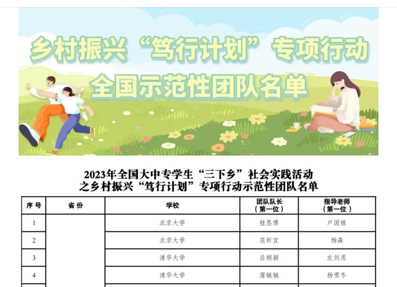 近日,共青团中央发布《2023年全国大中专学生“三下乡”社会实践活动之乡村振兴“笃行计划”专项行动全国示范团队名单》。经学生自愿报名、学校团委推荐、团省委遴选、团中央青年发展部审核,最终选出1000支全国性示范实践团队,我校文化教育学院学生曲别林更带队、普俊老师指导的“索玛花开”社会实践团队成功入选。这是我校参与“三下乡”社会实践活动以来第一次入选国家级重点团队,也是周口市唯一入选的专科院校团队。