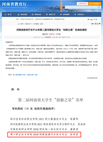 9月22日,河南省教育厅公布了第二届河南省大学生“创新之星”名单,此次共评选出年度大学生“创新之星”20名。经过二级学院(部)推荐、学校推荐、专家评审、网络点赞、公示等环节,我校汽车与机电工程学院新能源汽车技术专业2023届毕业生彭芳菲荣获第二届河南省大学生“创新之星”荣誉称号,这是我校学子连续两届获此殊荣。