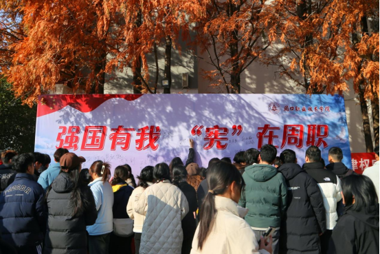 在第十个国家宪法日到来之际,为深入学习宣传贯彻党的二十大精神,认真贯彻习近平法治思想,进一步弘扬宪法精神、维护宪法权威、增强法治观念、普及宪法知识,根据《河南省教育厅关于开展2023 年教育系统“宪法宣传周”系列活动的通知》安排,12月4日上午,我校在艺术演播厅设置分会场,通过收看直播形式参与全国第十届“国家宪法日”宪法晨读活动。校领导李明臣、于爱霞,各院部党总支书记、学管副院长及200余名师生代表在分会场参加活动,全校万余名师生分班级开展国家“宪法晨读”活动。