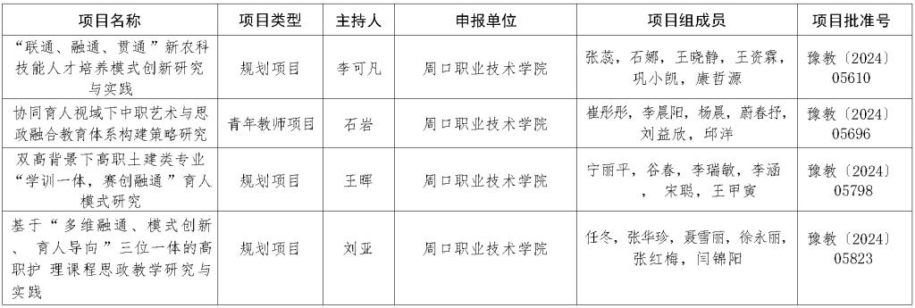 根据《河南省教育厅办公室关于开展2023 年河南省职业教育教学改革研究与实践项目立项工作的通知》(教办职成〔2023〕472 号)要求,我校遴选推荐的李可凡、石岩、王晖、刘亚四位教师的项目最终获批立项。