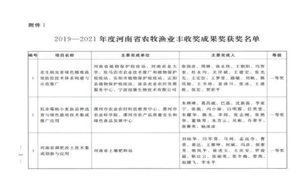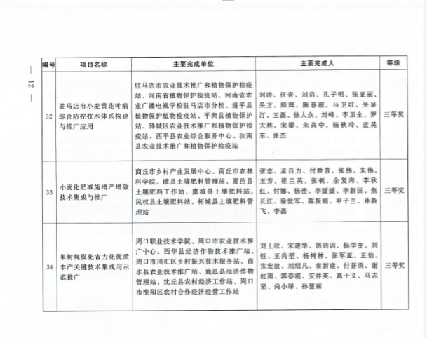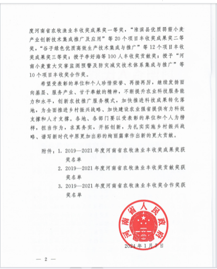 近日,河南省人民政府下发了《关于表彰2019—2021年度河南省农牧渔业丰收奖的决定》(豫政[2024]3号),由周口职业技术学院为第一完成单位,刘士欣教授主持,宋建华副教授、王尚堃教授主要参与的《果树规模化省力化优质丰产关键技术集成与示范推广》项目喜获河南省人民政府农牧渔业丰收奖三等奖。