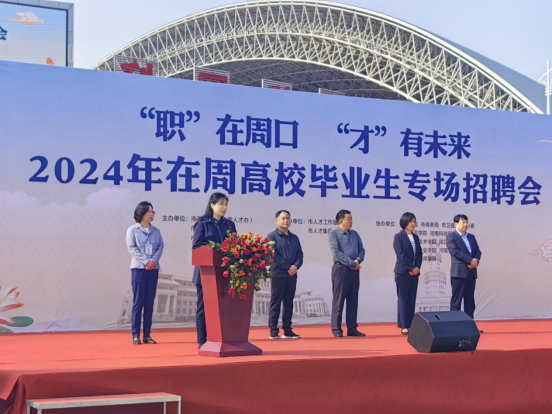 此次招聘会由市委组织部(市委人才办)、市教育体育局、市人力资源和社会保障局主办,市人才工作服务中心、市人才集团承办,旨在为贯彻落实省、市关于促进高校毕业生就业有关要求,进一步拓宽我市人才引进渠道,促进在周高校毕业生留周就业。市委常委、组织部部长路培果出席活动并致辞,副市长刘颖主持活动。我校副校长王隼带领招生就业处全体工作人员、二级学院(部)党总支书记和近2000名学生参加此次活动。