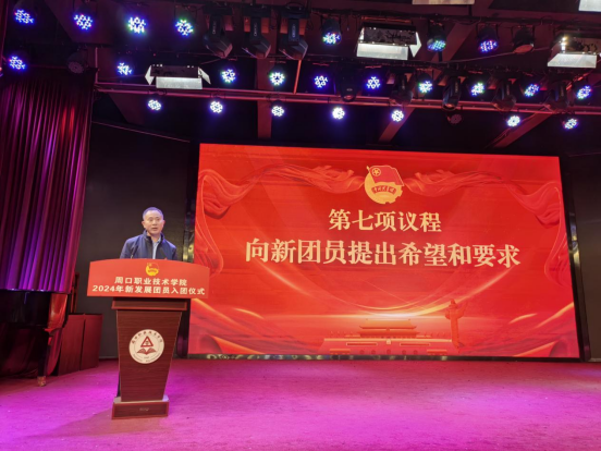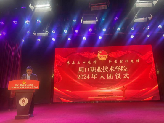 为深入贯彻习近平总书记关于青年工作的重要思想,增强共青团的思想政治引领作用,进一步增强团组织的凝聚力和向心力,4月30日上午,校团委在开元校区艺术演播厅举行周口职业技术学院2024年新团员入团仪式。学校党委副书记、工会主席郭汝礼出席,团委全体成员、各院部团总支书记、新发展团员及优秀团员代表参加。仪式由校团委书记闻檑主持。