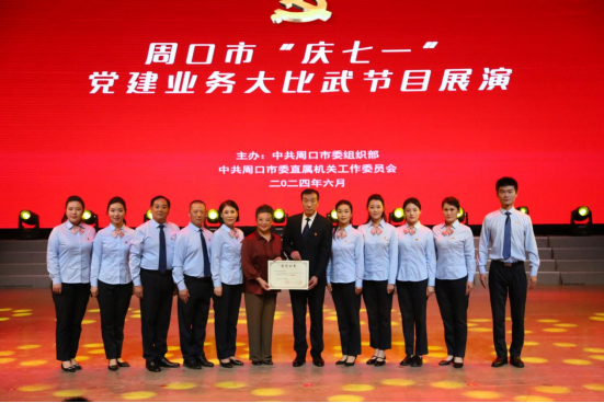 为深入学习贯彻落实党的二十大精神和习近平总书记关于党的建设和组织工作的重要思想,热烈庆祝中国共产党成立103周年,全面展示我市基层党组织党建业务开展成效和创新做法,6月27日,周口市委组织部、周口市委直属机关工作委员会联合举办“庆七一”党建业务大比武节目展演。我校精心编排的作品《一心向党》凭借其深刻的主题、生动的演绎和真挚的情感,从众多作品中脱颖而出,荣获一等奖。