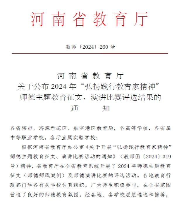 近日,河南省教育厅2024年“弘扬践行教育家精神”师德主题教育征文、演讲比赛评选结果公布,我校教师在征文活动中再获佳绩,斩获一等奖1项、二等奖1项、三等奖2项。
