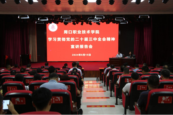 按照市委统一安排部署,8月15日上午,学校在开元校区艺术演播厅召开学习贯彻党的二十届三中全会精神专题报告会,特邀周口市委党校校务委员刘晓玉同志作专题辅导报告。学校副科级以上干部,马克思主义学院全体教师参加会议。校党委副书记、工会主席郭汝礼主持。