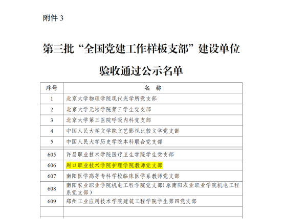 近日,教育部思想政治工作司公布了第三批“全国党建工作样板支部”建设单位验收通过名单,我校护理学院教师党支部顺利通过验收。