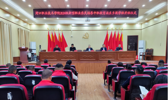 11月8日上午,周口职业技术学院2024级新型职业农民培养中职教育汤庄乡教学班在商水县汤庄乡举行开班仪式。汤庄乡党委书记邵东建、人大主席霍杰,周口职业技术学院党委副书记李明臣、农牧工程学院党政负责人出席开班仪式。仪式由霍杰主持。