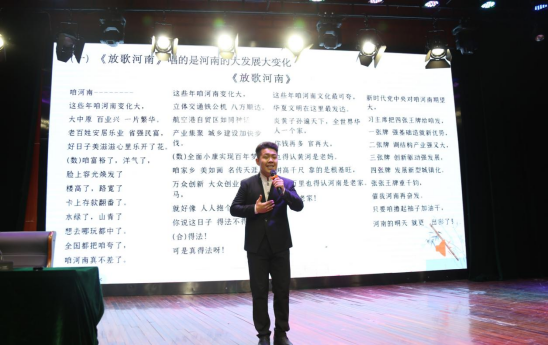 杨盛道教授不仅详细解读“老家河南”系列豫剧戏歌,带领师生共同鉴赏其中的经典片段,还穿插了精彩的文艺表演。周口职业技术学院教授、国家一级演员李香和刘秋红分别演唱《穆桂英挂帅》《沁园春·雪》,河南艺术职业学院校友、河南豫剧三团优秀青年演员宋长流演唱《放歌河南》和豫剧戏歌《小芳》,赢得现场师生的阵阵掌声。