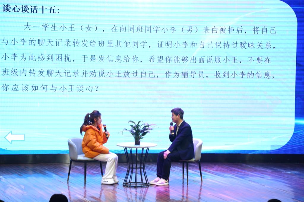 决赛设置“案例研讨”和“谈心谈话”两个环节,全方位考察辅导员综合素质。“案例研讨”环节,18名选手随机分为9组,以“AB角随机组合”形式开展研讨;“谈心谈话”环节,模拟真实工作场景,与学生进行沟通。参赛辅导员们凭借丰富的工作经验和扎实的理论素养,逐一破解难题,赢得现场观众的阵阵掌声。