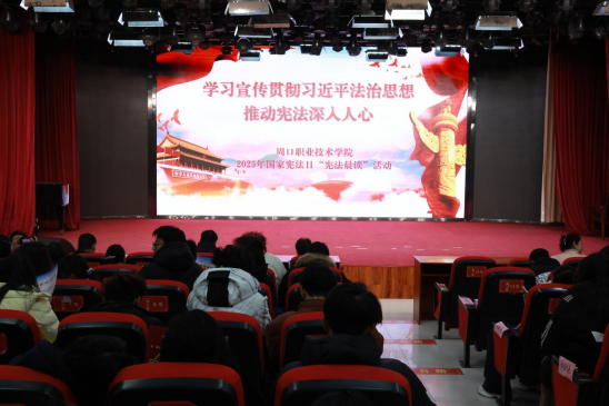 活动伊始,周口职业技术学院分会场通过视频连线与北京主会场一同诵读《中华人民共和国宪法》的部分条款,共同学习宪法,进一步理解宪法精神。随后,全体师生合唱歌曲《宪法伴我们成长》,并观看第十届全国学生“学讲宪法”活动全国总决赛优秀选手展演等。