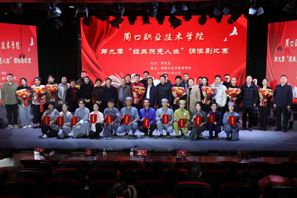 为切实落实立德树人根本任务,深入学习贯彻伟大建党精神,传承红色基因,12月25日下午,弘扬建党精神,培育时代新人——周口职业技术学院第九季“经典照亮人生”诵读比赛在开元校区砺德厅成功举办。周囗中华职教社秘书长郑立冬、周口市中小企业商会会长杨留峰等嘉宾,校长李清臣,校领导李明臣、李秀萍、王隼、于爱霞、李向东,学校各相关职能部门、二级院部主要负责人及800余名师生共同观看。