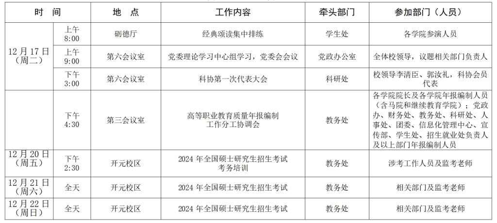 一周主要工作安排(12月16日-12月22日)