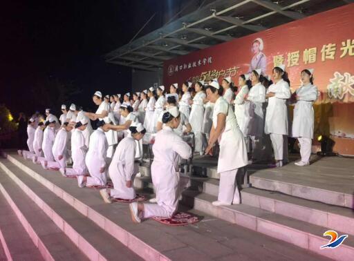 仪式上,医学系护理专业的200多名学生依次上台以跪姿虔诚地接受了护理前辈为她们戴上的燕尾帽,并从护理前辈手中接过象征南丁格尔精神的红烛。