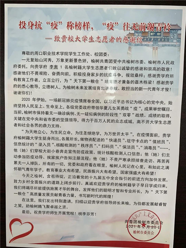 本网讯 3月13日,周口职业技术学院校团委收到一封特殊的感谢信,这是一封来自共青团榆树市委员会的致谢信。