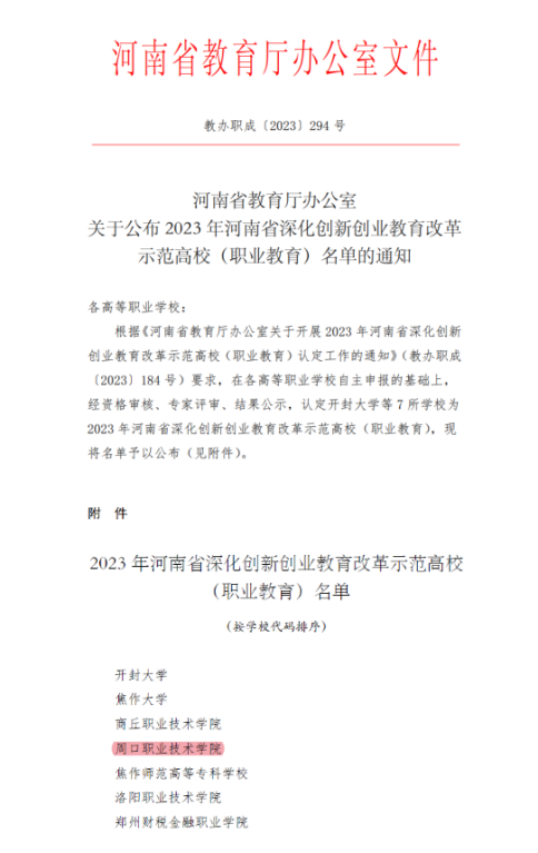 8月21日,河南省教育厅下发《河南省教育厅办公室关于公布2023年河南省深化创新创业教育改革示范高校(职业教育)名单的通知》(教办职成〔2023〕294号),全省共7所高职院校入选,周口职业技术学院位列其中。