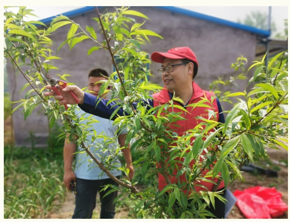 一到李堂行政村,王尚堃就与村支书李秀才就本次科技服务行程进行交流沟通,之后来到果农李宗吕的蟠桃园进行现场指导。针对李宗吕遇到的蟠桃蚜虫不好防治的问题,王尚堃给出防治蚜虫的三个用药方案,指出防治关键节点及用药种类。王尚堃又通过现场察看,指出近阶段蟠桃管理的主要工作,并为其传授管理技术要点。