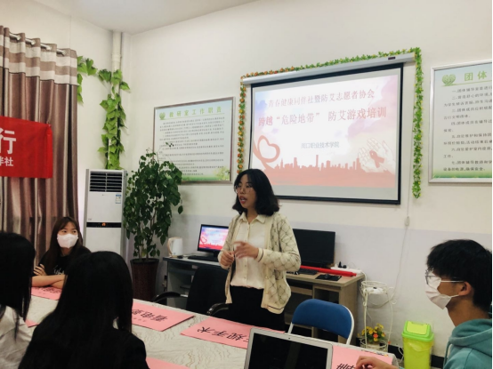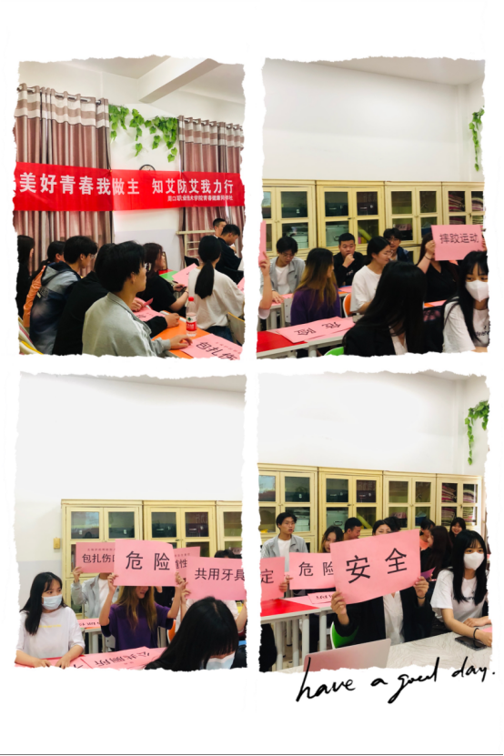 为了宣传普及“预防艾滋病”安全行为和不安全行为常识,培养学生将高危行为转为低危或无危行为的意识和能力,5月25日下午,我校青春健康同伴社暨防艾协会在行政楼四楼团体心理咨询室组织举办了跨越“危险地带”防艾知识宣传活动,本次活动由学生处主办,思政部承办,心理健康教育中心教师张文华担任指导老师并主持。