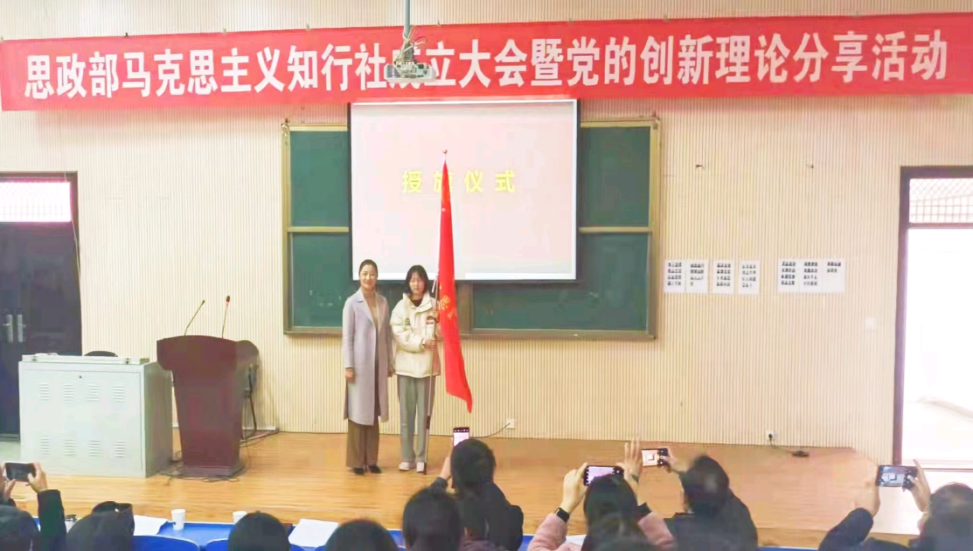 会上,全体师生合唱国歌。歌毕,刘冬霞主任致辞,她提出社团要立足服务,踏实工作的指导性意见。接着,社团指导老师杨帆介绍了社团组成及各部门职责,并承诺将重视和监督社团工作。然后,王江耀和卢嘉夷作为干部代表发言并表示,全体成员将积极学习马克思主义。随后,各位领导为社团干部颁发聘书并对他们表示祝贺。刘冬霞主任为马克思主义知行社授旗,副社长李向田接旗。最后,思政部教管办主任范文婷老师进行了关于党的创新理论的精彩宣讲。大会最后一项,马克思主义知行社领导老师和社员拍照留念。