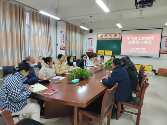 为推动主题教育走深走实、见行见效,进一步提升党员作风和能力建设,12月21日,周口职业技术学院五年制大专部特邀请“白发校长”、“出彩河南人”2021最美教师特别奖获得者、太康县清集镇二郎庙小学校长张鹏程到中州校区参加“学习身边的榜样”主题党日活动。校党委副书记李明臣,五年制大专部教师党员参加,此次主题党日活动由五年制大专部党总支书记张建刚主持。