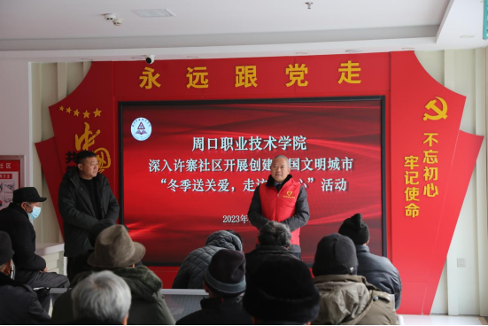 入冬以来,我市气温大幅下降,为进一步深化“入户大走访”活动,充分发挥我校作为省级文明校园标兵的示范作用,确保群众安全过冬、温暖过冬,12月27日上午,学校党委宣传部部长万四新带领党员志愿者深入许寨社区开展了“冬季送关爱,走访暖人心”活动。
