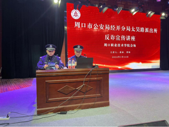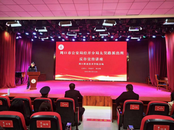 为营造良好法治教育环境和氛围,进一步增强学生法治观念与安全意识,深入推进平安校园建设,3月14日,周口职业技术学院组织开展打击治理电信网络诈骗犯罪专题讲座。讲座邀请周口市公安局经开分局太昊路派出所民警蒋林、付建平作报告,开元校区全体学生分4场次聆听专题讲座。