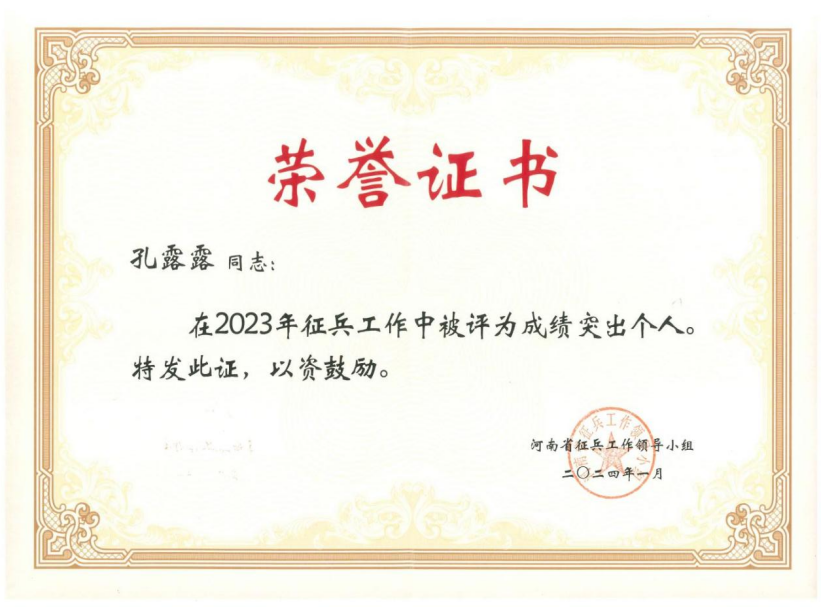 为褒扬先进、树立导向,激励广大征兵工作人员在今后工作中奋发进取、建功立业,充分发挥先进典型的带动作用,近日,经河南省征兵工作领导小组审核决定,共评选出127名同志为2023年度河南省征兵工作成绩突出个人,我校武装部孔露露老师受到通报表彰。